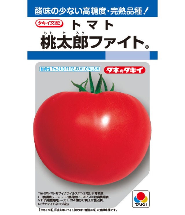 特長 糖度が高く、完熟出荷に適する。 果色は濃桃色で、果実全体から均一に着色する。 果形は腰高で、果重は210g程度。チャック・窓あき果の発生は少なく秀品率が高い。 トマトモザイクウイルス(Tm-2a型)、萎凋病レース1(F1)およびレース2(F2)、根腐萎凋病(J3)、半身萎凋病レース1(V1)、葉かび病(Cf4)、斑点病(LS)、サツマイモネコブ線虫(N)に複合耐病虫性のほか、青枯病(B)にも比較的強い。 栽培の要点 抑制栽培では、本葉5~6枚の若苗定植を基本とする。 追肥重点型の肥培管理を行う。 定植後の最初の追肥は、3段花房の開花時期を目安に行う。 # トマト 「桃太郎ファイト」(DF) 健康に育つ美味しさ追求の大玉トマト! ## 特性 1. **耐病性に優れた栽培向き** トマトモザイクウイルス(Tm-2a型)、萎凋病レース1(F1)、葉かび病(Cf9)に対する高い耐病性を誇ります。これにより安心して栽培ができ、家庭菜園でも活躍します。 2. **安定した草勢** 初期の草勢がしっかりしており、栽培後半までスタミナを維持します。この特性により、草勢管理が容易で、着果性も非常に高いです。 3. **果実の形状と食味** 豊満な果形(果重約210g)で、果実は硬玉で樹上完熟が可能です。糖度と酸味の絶妙なバランスが取れた、まさに味わい豊かなトマトです。 4. **秀品率の高さ** 除外性が高く、裂果の発生が少ないため、秀品率も非常に高いです。また、日持ちも良く、出荷に適した品質を維持します。 5. **高い着果性** 下段から果実の肥大が良好で、多収が期待できます。多くの花が咲くため、着果のチャンスが増えます。 ## 適応性 抑制栽培と促成栽培に特に適しています。また、家庭菜園での栽培にも向いています。 ## 育苗・育苗管理 播種床の地温は25~28℃を維持し、播種後14日前後の本葉1.5枚時に移植を行います。葉が接触するころには苗広げを行い、育苗面積を十分に確保します。液肥などで必要に応じて追肥を行います。 ## 定植準備 圃場の土壌診断を行い、適正な肥料設計を立てます。元肥量は圃場により異なりますが、窒素12~15kg、リン酸15~20kg、カリ15~20kgを基準とします。 ## 定植および管理 定植はがく割れ~第1花の開花時期が基本で、若苗の定植は避けます。灌水は第1段着果~果実肥大期に行い、育成を促進します。追肥は4段花房開花を目安に行い、草勢を見極めながら適切に実施します。 ## 病害虫防除 病害虫防除には、特に注意が必要です。アブラムシやコナジラミなどの防除を徹底し、育成期の保護を行うことが重要です。 ## 栽培上の注意点 ・草勢の維持が成功の鍵です。初期から適切な管理を心掛けてください。 ・灌水不足は果実の質に影響を与えますので、天候に応じた適切な灌水が重要です。 ・赤熟収穫には適した品種ですが、栽培初期に日照過剰や圃場の乾燥があると注意が必要です。 ・厳寒期の管理も大切で、果実が葉に隠れることがあるので、適切な玉だし作業を行います。経済的な農薬散布を心掛けつつ、防除も怠らないようにしましょう。 美味しいトマト作りを楽しむために、「桃太郎ファイト」をお選びください!