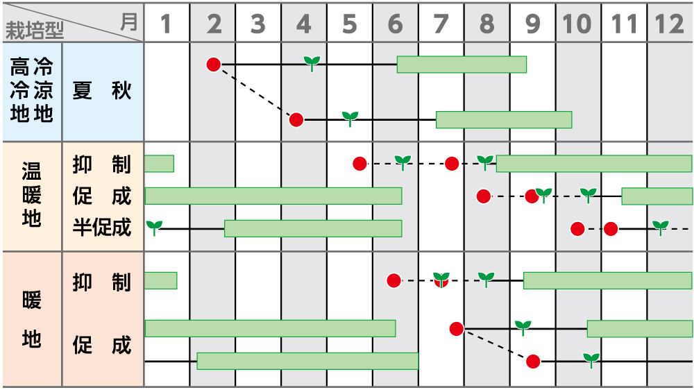 定植は第1花開花前を基本とし、若苗定植が向いています。灌水は、1段果実肥大期ごろを目安に行いますが、異常茎の発生に注意します。追肥は3段花房開花ごろを目安に草勢を見てします。