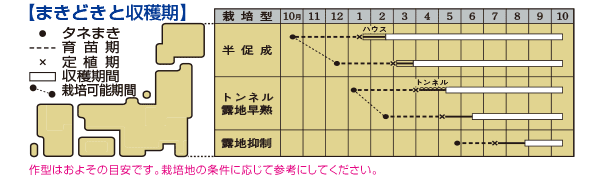 ・果形は「千両二号」と同等の長卵形で、果ぞろいがよく、夏秋栽培を中心に幅広い作型に適する。