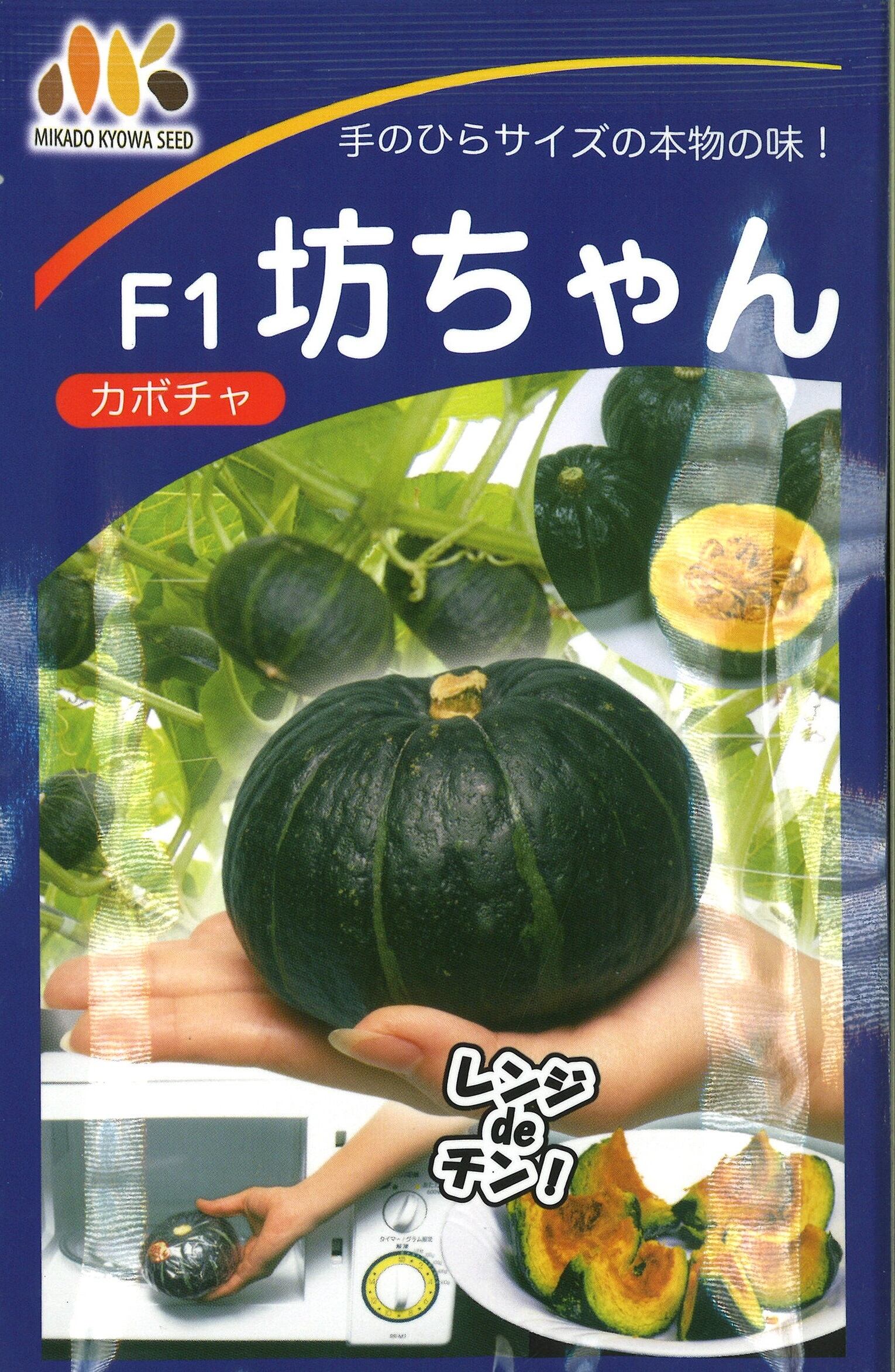 ・果重500g前後、果皮色は黒緑色に浅いストライプが入った扁平の強粉質種で、ミニカボチャとして特に食味よく、ラップをかけて電子レンジで丸ごと5~8分過熱するだけで美味しく食べられる。
