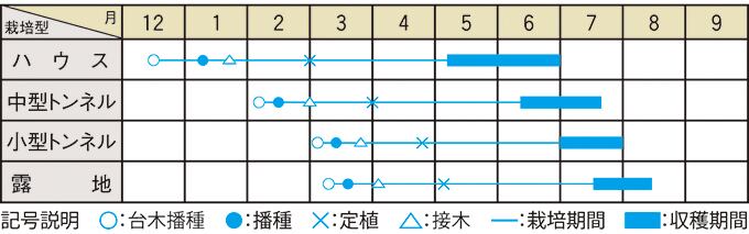 元肥は全面施肥・1㎡あたり、苦土石灰100g・堆肥3kg・有機入り化成肥料100gとする。畦幅2.5~3.0m、株間1mでポリマルチを張る。トンネルまたはホットキャップをして、本葉4~5枚の苗を畦端30㎝に定植する。子ヅルは畦方向に対し直角に伸ばす。