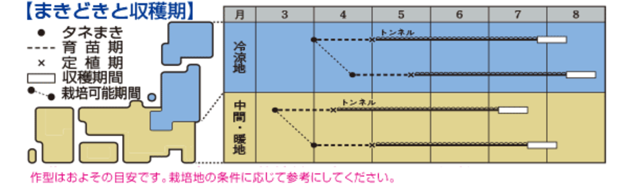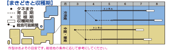 ・放任栽培も可能だが、子づる2~3本仕立てとし、6節以降から連続着果させると果ぞろいがよくなる。