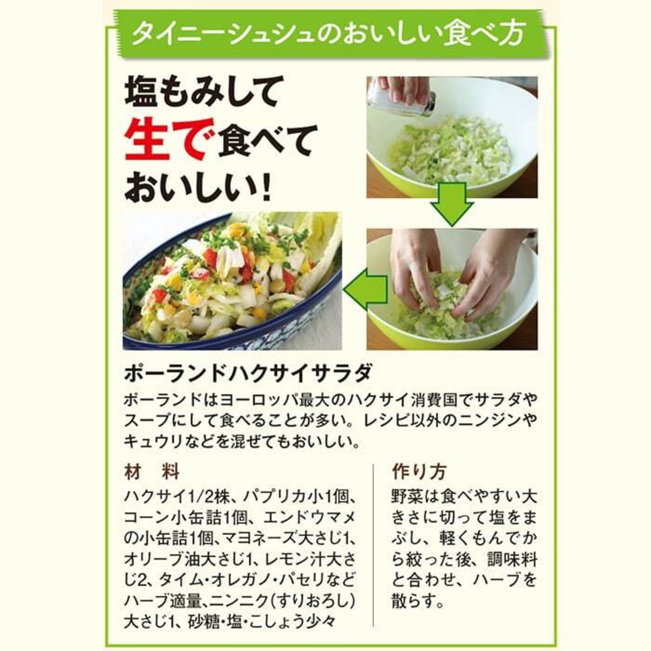 加熱しても生でもおいしいミニハクサイ。鍋物はもちろんですが、浅漬けやサラダにもおすすめです。
