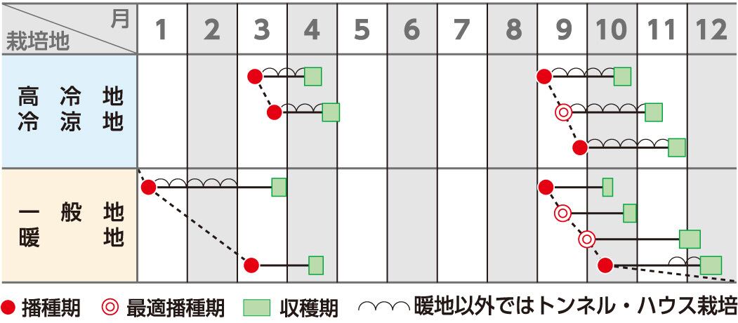 「プログレス」より生育はやや緩慢だが、耐寒性があるので、 濃緑葉を好む産地ではトンネルを利用すると幅広い作型での使用も可能。