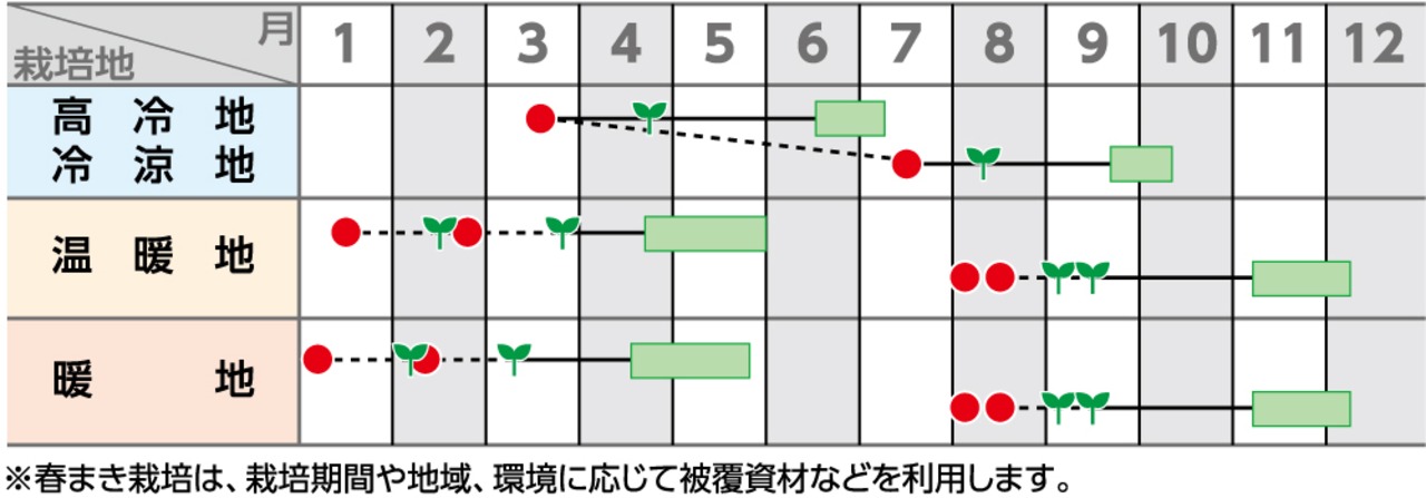 ● 栽培適応性が広く、一般地、暖地秋どり・初夏どりのほか、高冷地・冷涼地夏どり・初秋どりにも適する。
