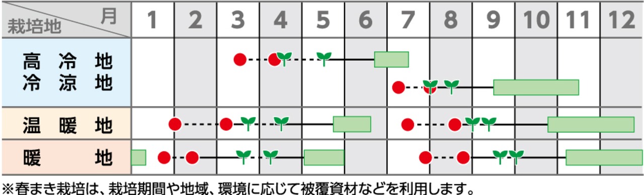 温暖地の夏まきでは7月中旬~8月中旬に播種し、10月下旬~12月下旬に収穫します。春まきでは2月上旬~下旬に播種し、5月中旬~6月中旬に収穫します。寒冷地では3月~4月に播種し、6月中旬~7月下旬に収穫するものと、6月上旬~7月下旬に播種して、9月上旬~11月上旬に収穫する栽培型に適します。 土壌は水田から火山灰土まで各種土壌に適応します。