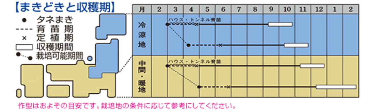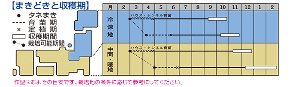 ・低温伸長性にすぐれるため適期収穫を心掛け、とり遅れにならないよう注意する。また、土寄せは夏場まで極力控える。