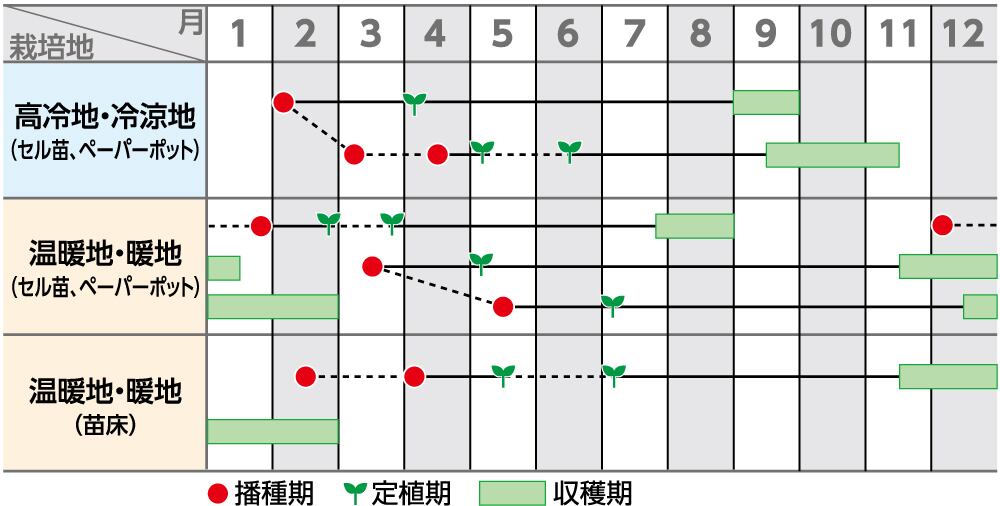 ・秋まき栽培では、早まきすると抽苔が多く発生することがあるので、その地域の適期播種を心がけます。