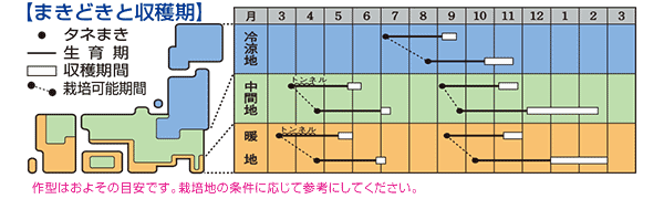 ・春まき・秋まき栽培ともに無理な早まきをするよりも、順調に育てて早どりをねらう。